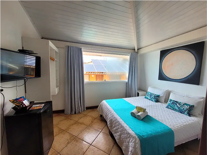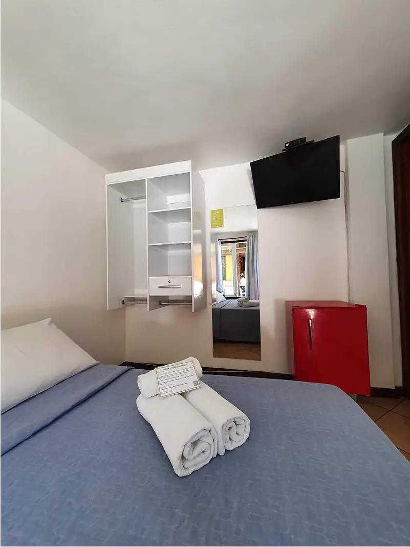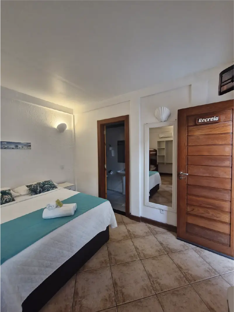 SUÍTE STANDART | A Suíte Canto é uma opção espaçosa e funcional para até quatro pessoas, ideal para famílias ou amigos. Oferece todo o conforto necessário para recarregar as energias e explorar a cidade, com a conveniência de estar a poucos passos da praia.