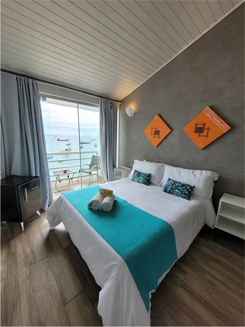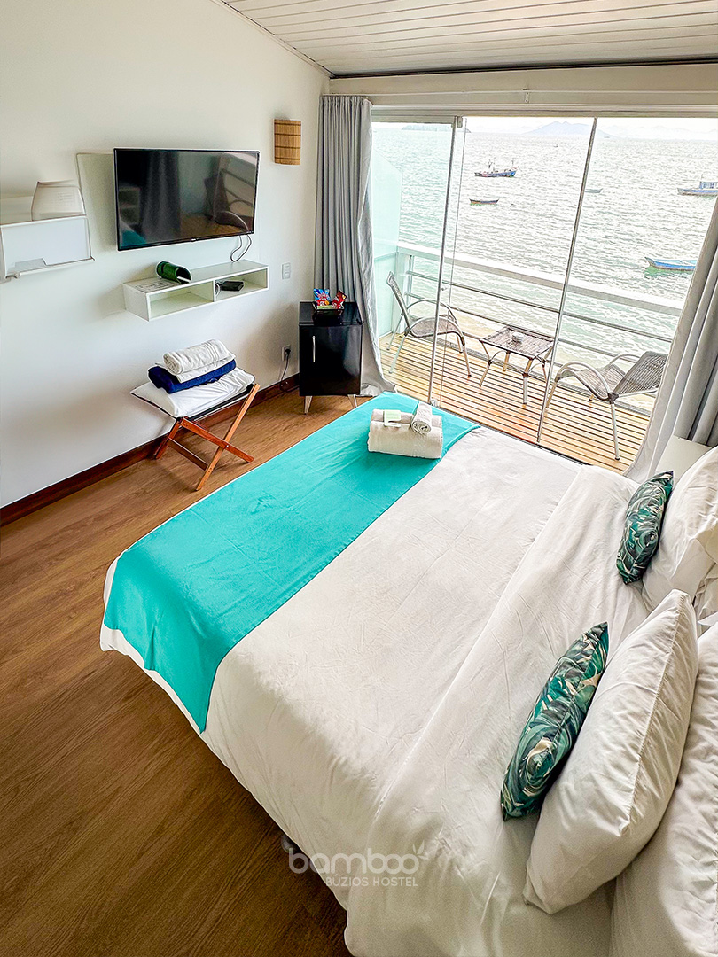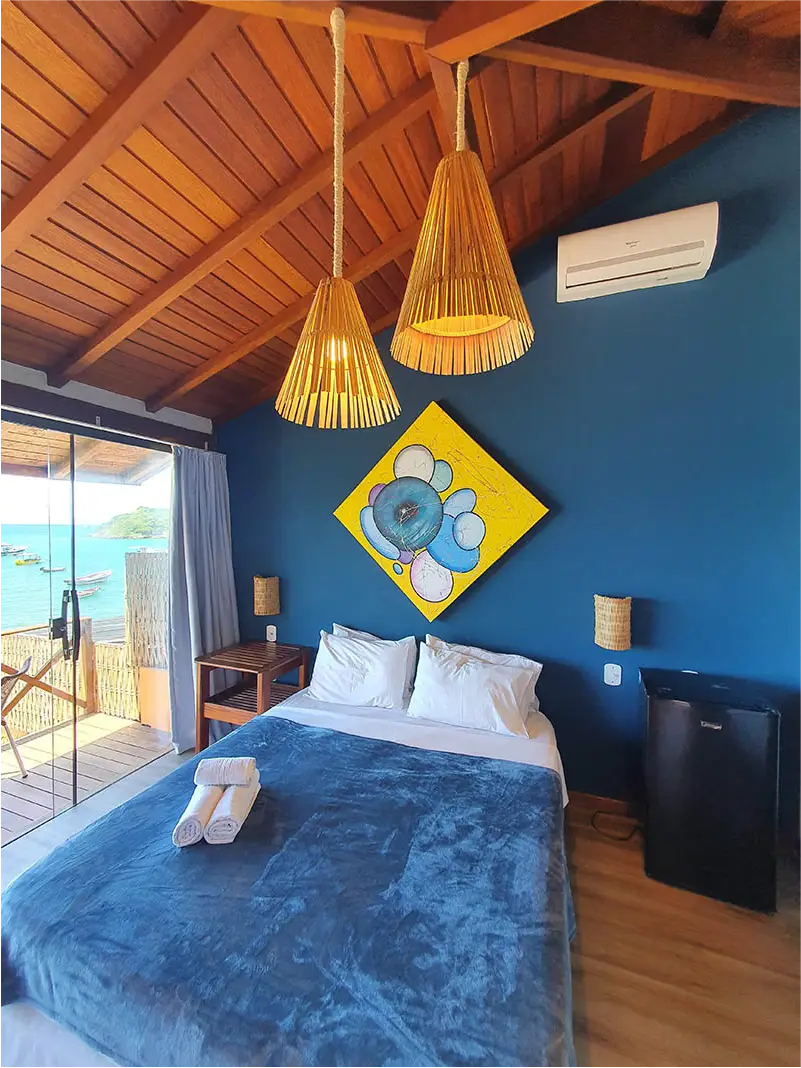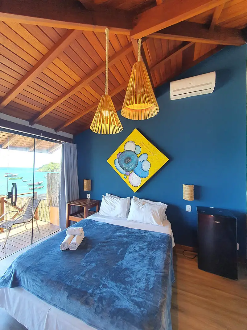 SUÍTE STANDART | Charme e aconchego com a brisa do mar. Ideal para casais, a Suíte Formosa é um quarto acolhedor com uma charmosa vista lateral para o mar. É a escolha perfeita para quem busca um espaço íntimo e prático para aproveitar o melhor de Búzios, com o som das ondas como trilha sonora.