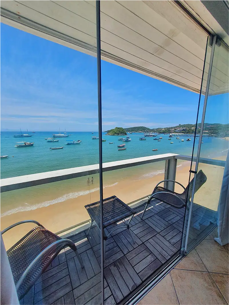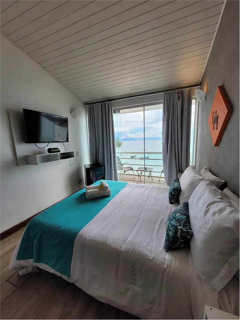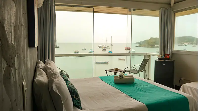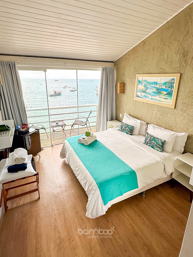 SUÍTE SUPERIOR COM VISTA FRENTE MAR | A Suíte João Fernandes oferece uma vista cativante da Praia do Canto, em um ambiente espaçoso que acomoda até três pessoas. É a escolha ideal para quem quer sentir a brisa do mar e ter o cenário buziano como parte da sua estadia.