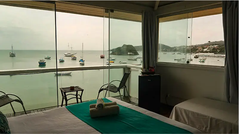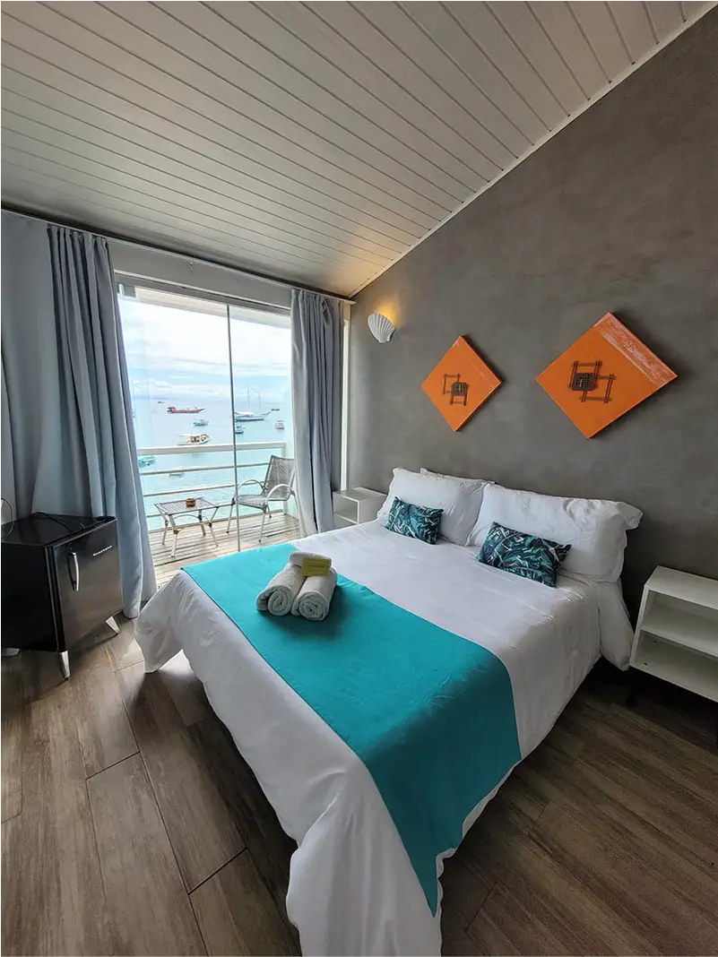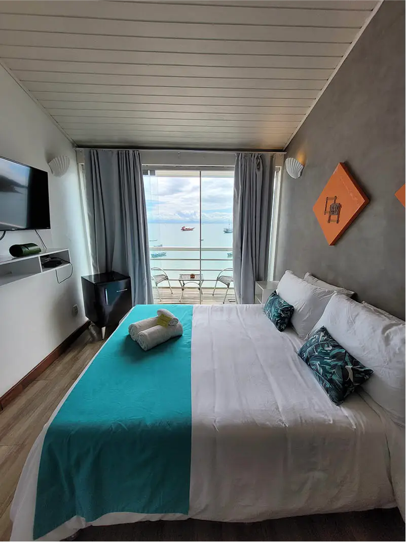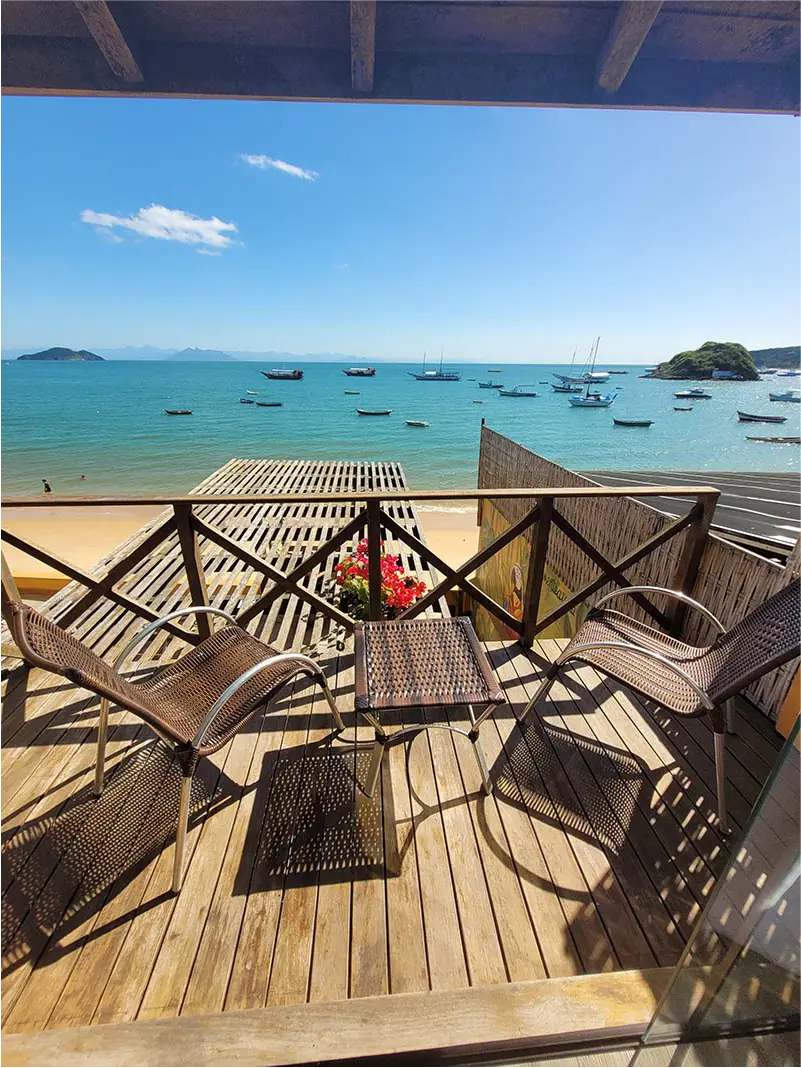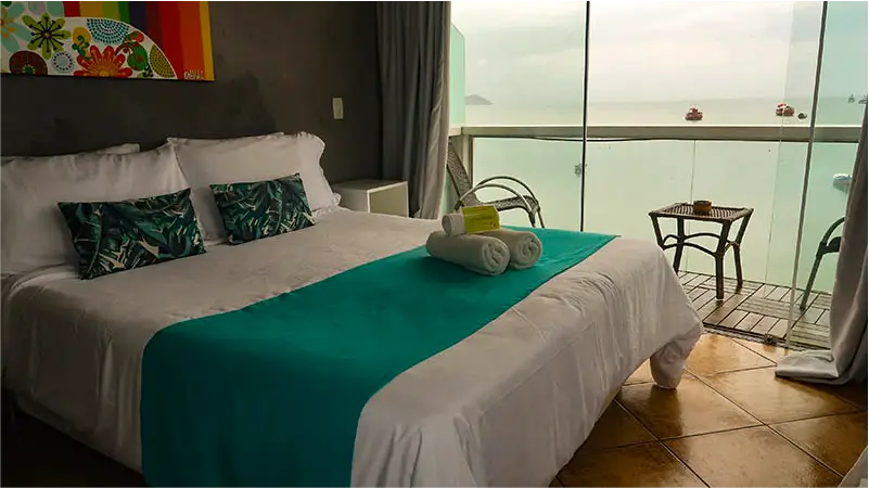 SUÍTE SUPERIOR COM VISTA FRENTE MAR | A Suíte João Fernandes oferece uma vista cativante da Praia do Canto, em um ambiente espaçoso que acomoda até três pessoas. É a escolha ideal para quem quer sentir a brisa do mar e ter o cenário buziano como parte da sua estadia.