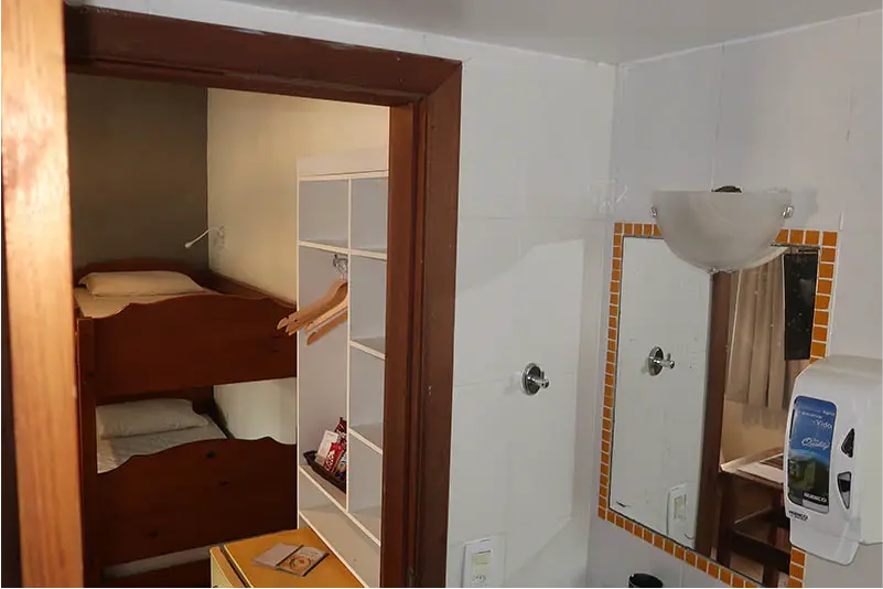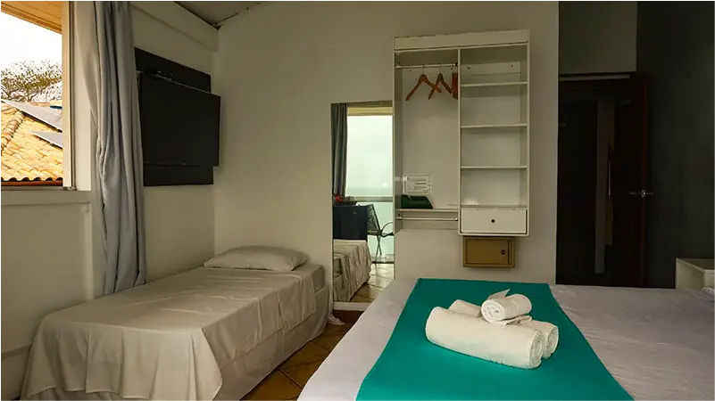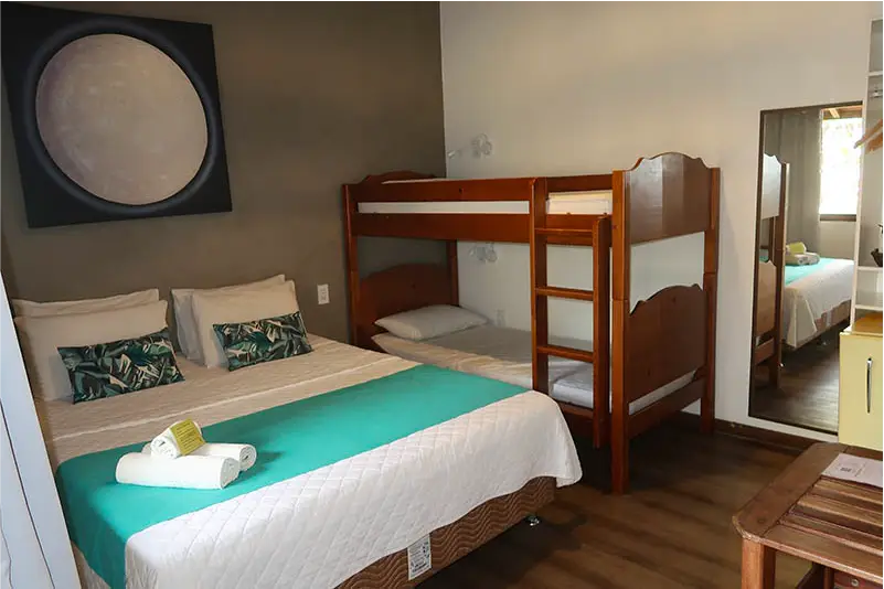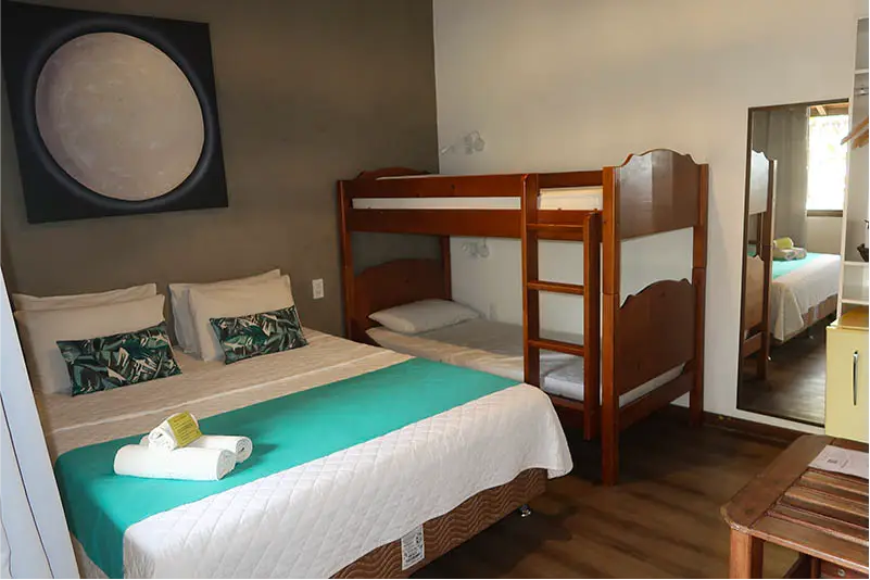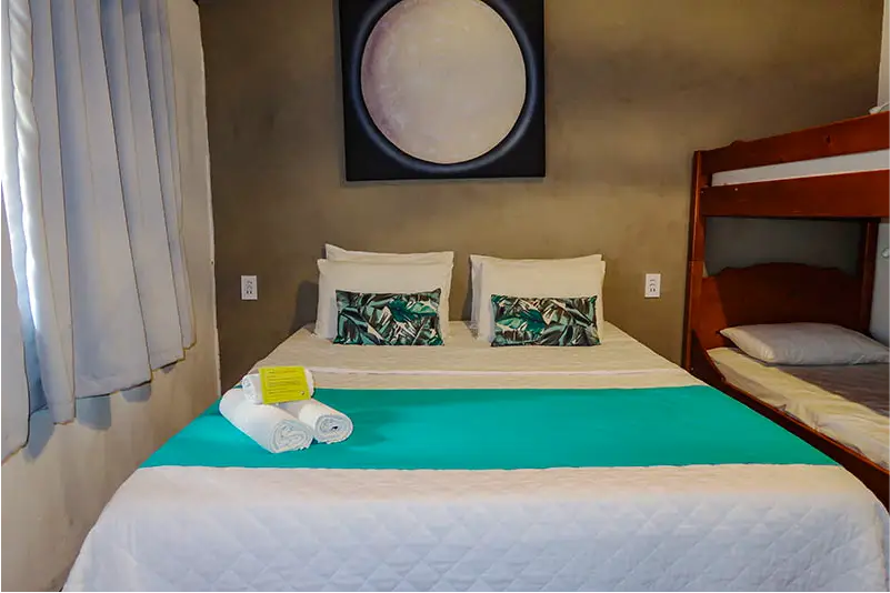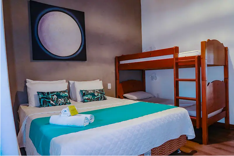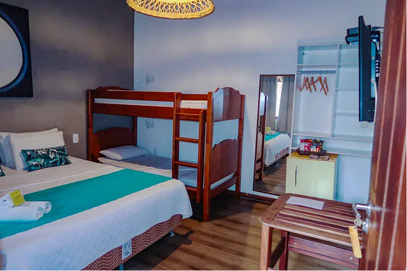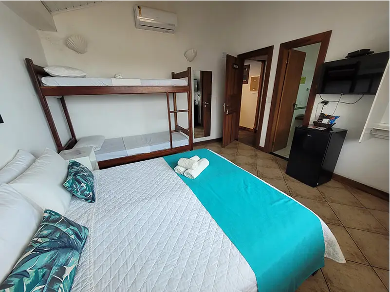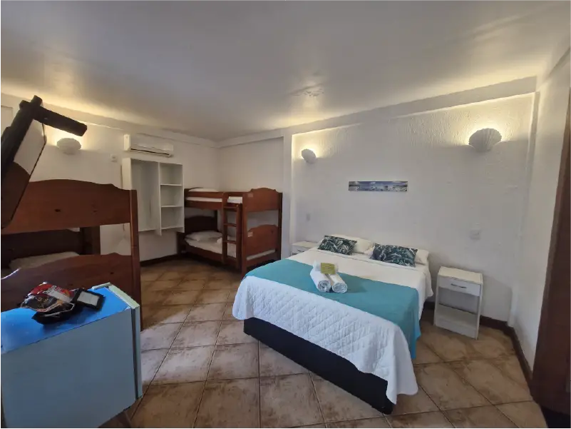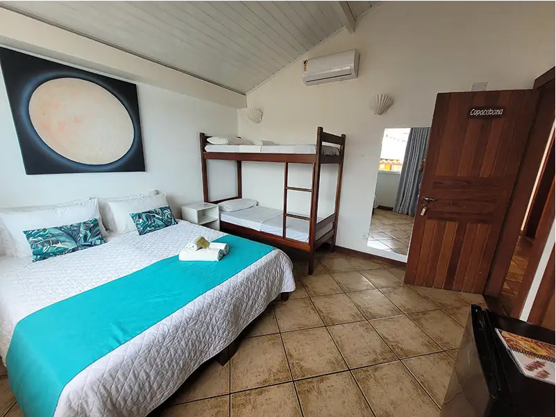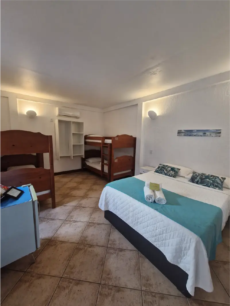 SUÍTE FAMILIAR | A solução completa para sua viagem em grupo. A Suíte Urca oferece uma ampla acomodação para até seis pessoas, combinando conforto e praticidade. É o quarto ideal para quem não abre mão de viajar com todos os amigos ou a família grande, garantindo uma estadia tranquila e bem localizada.