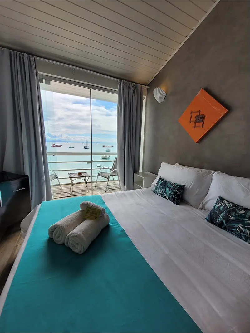 SUÍTE SUPERIOR COM VARANDA FRENTE MAR | Versatilidade e conforto com uma vista inspiradora. A Suíte Prainha adapta-se perfeitamente às suas necessidades, podendo ser configurada com uma cama de casal ou duas de solteiro. Sua varanda privativa com vista para o mar adiciona um toque de magia, tornando-a ideal para amigos ou casais que buscam uma estadia personalizada.